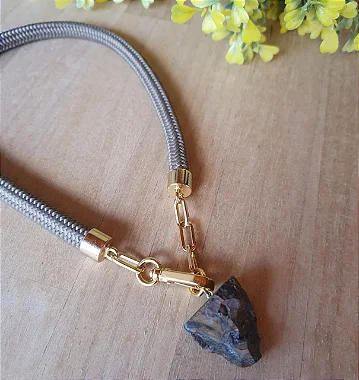 Colar em corda de polipropileno 8mm e corrente dourada com pedra olho de tigre bruta.