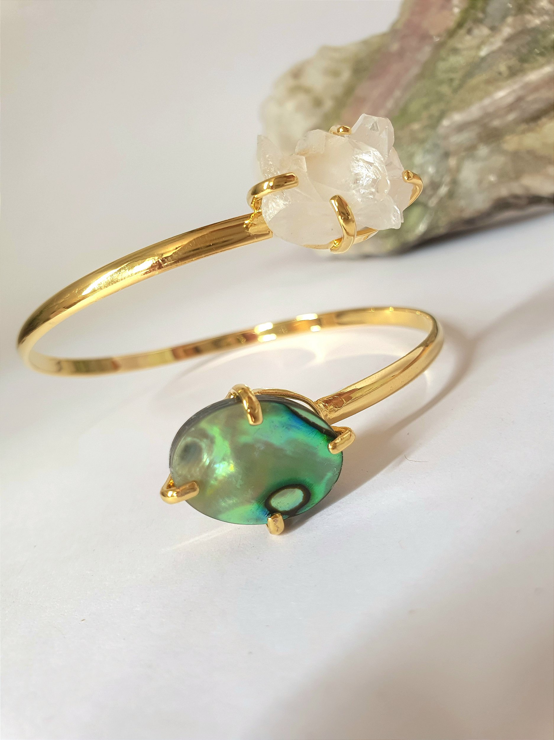 Bracelete ajustavél banhado à ouro ou prata com pedras naturais de abalone e drusa de cristal.