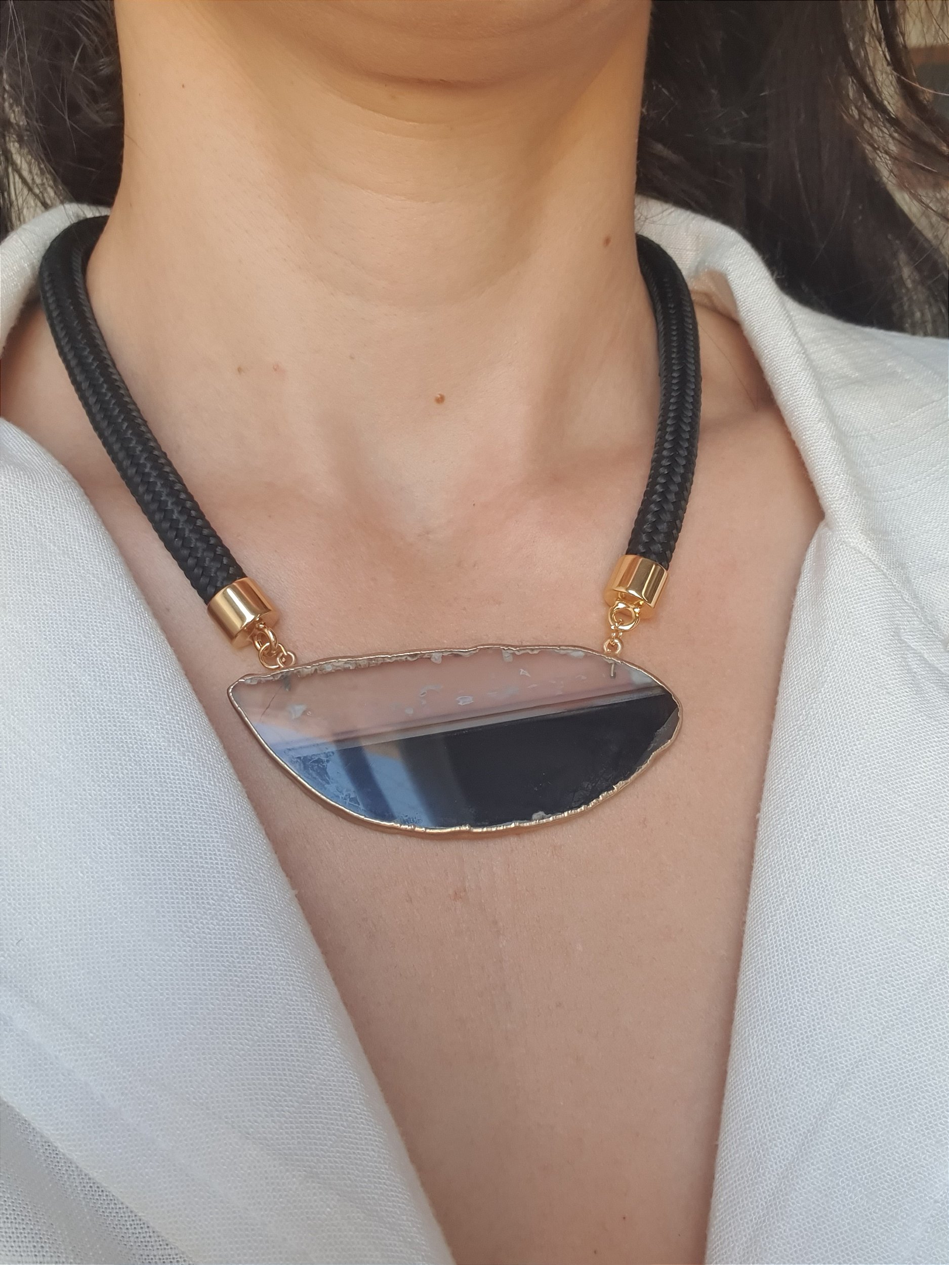 O Colar Atria Corda da Riluce é confeccionado corda de polipropleno e pedra natural com dois furos.