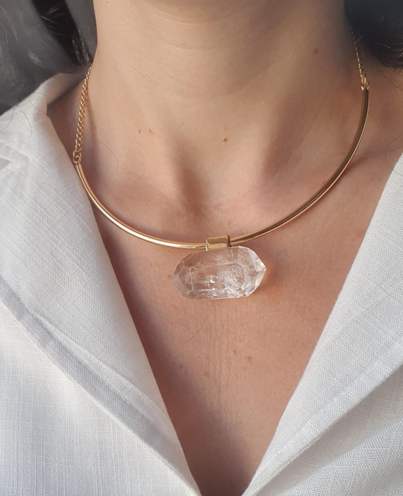 Colar em aro de metal prateado ou dourado com pedra polida a mão biterminada de quartzo cristal.
