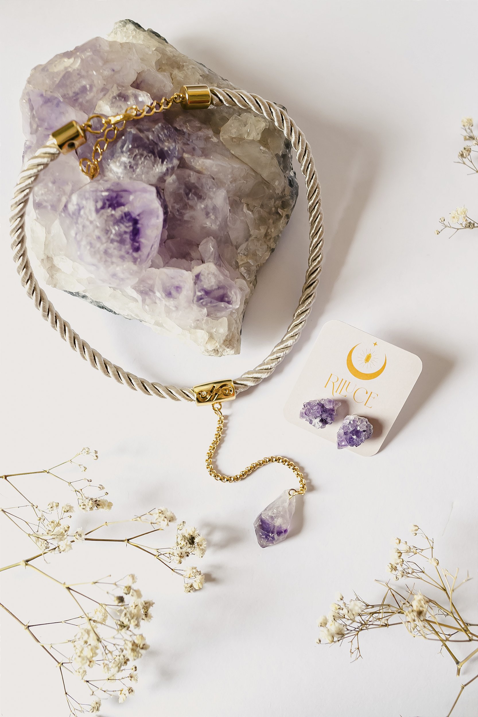 O Colar Centauro da Riluce é confeccionado com cordão de São Francisco, ferragens e pingente de pedra natural de ametista.
