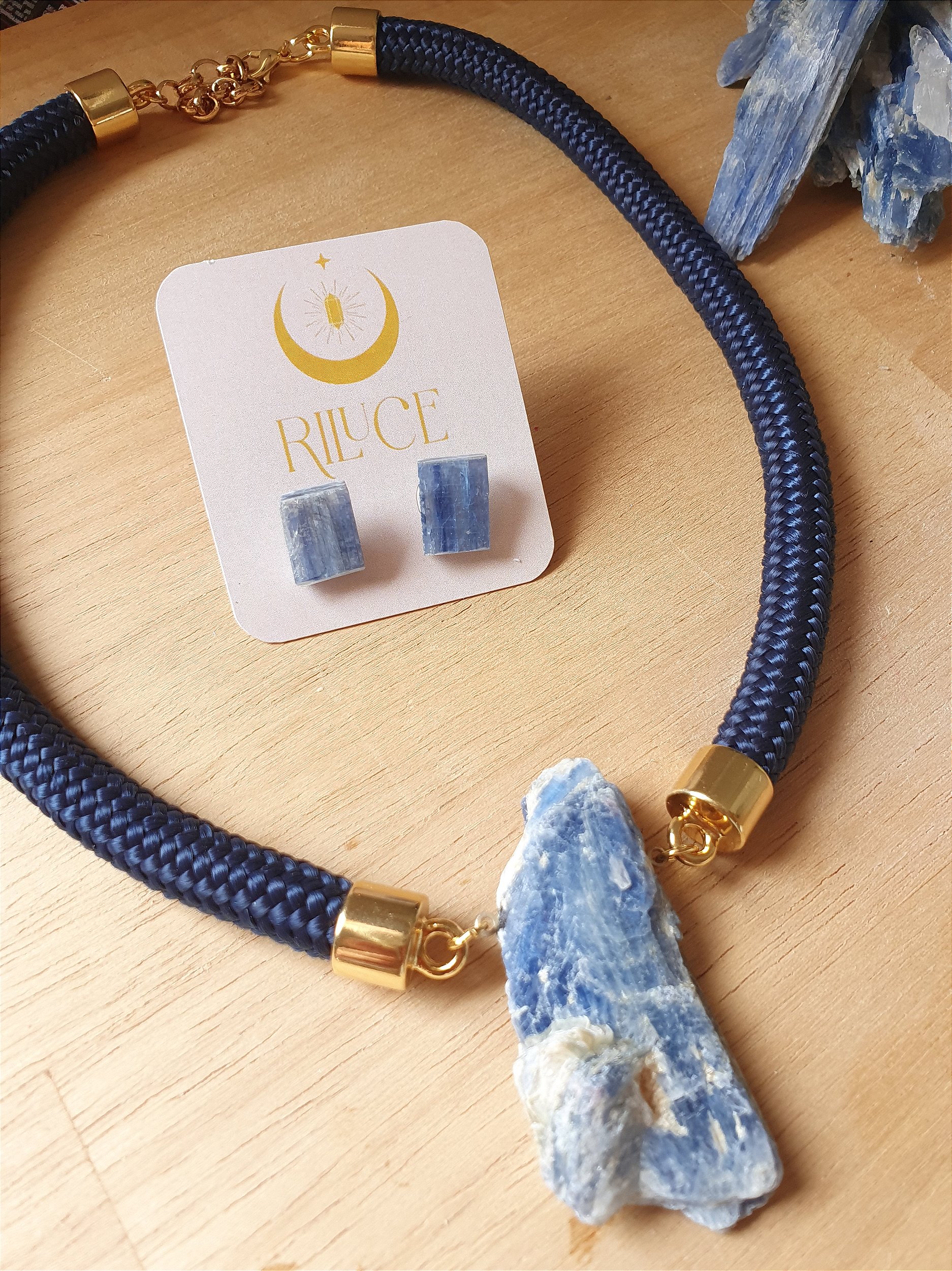 Conjunto contendo colar modelo Atria com pingente de cianita azul e brincos de cianita azul com tarracha. Material: Zamac com banho em verniz, excelente durabilidade.