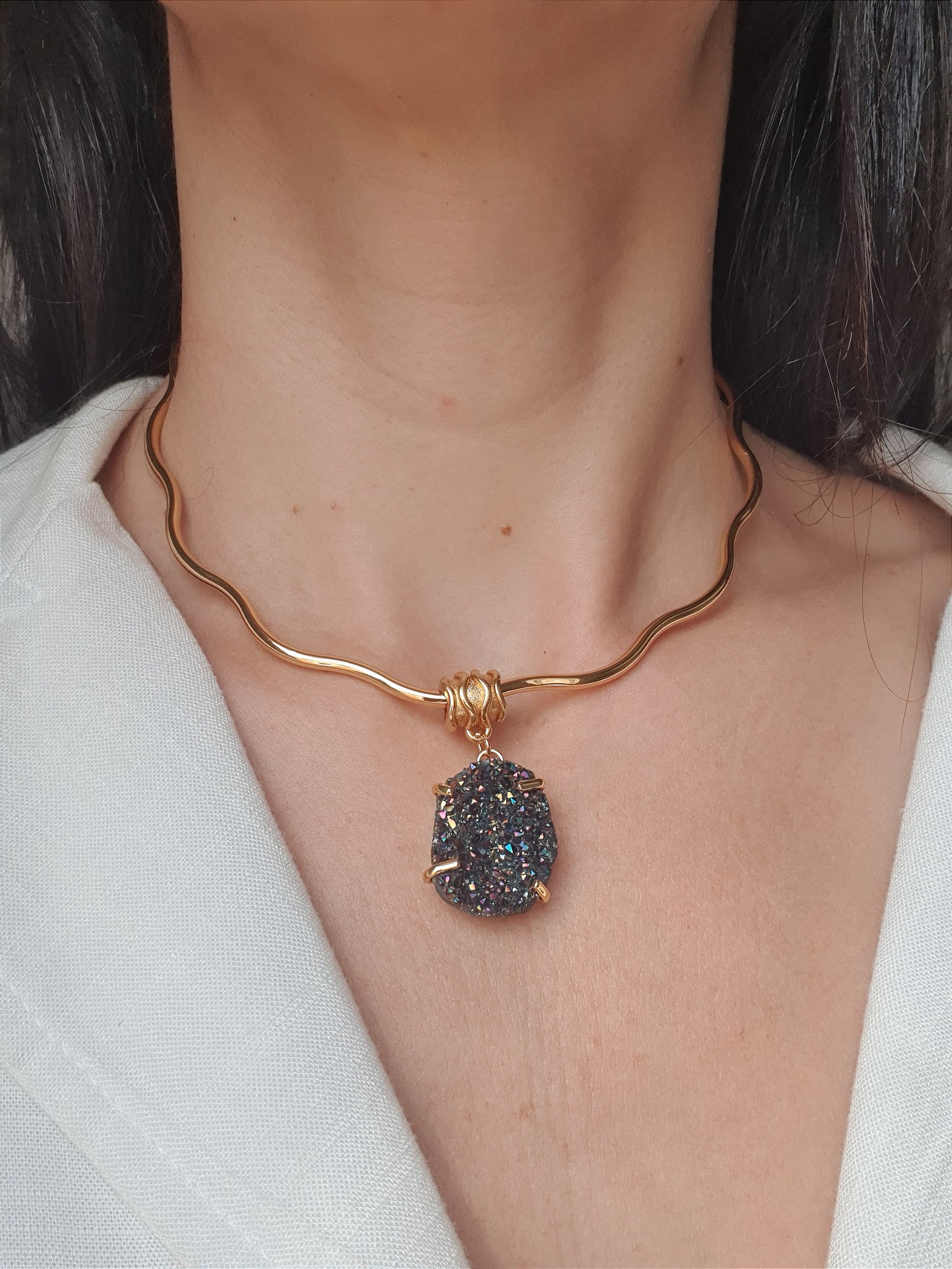 O Colar Alvorada Onda da Riluce é confeccionado com aro de metal ondulado com corrente extensora e pingente de pedra natural.