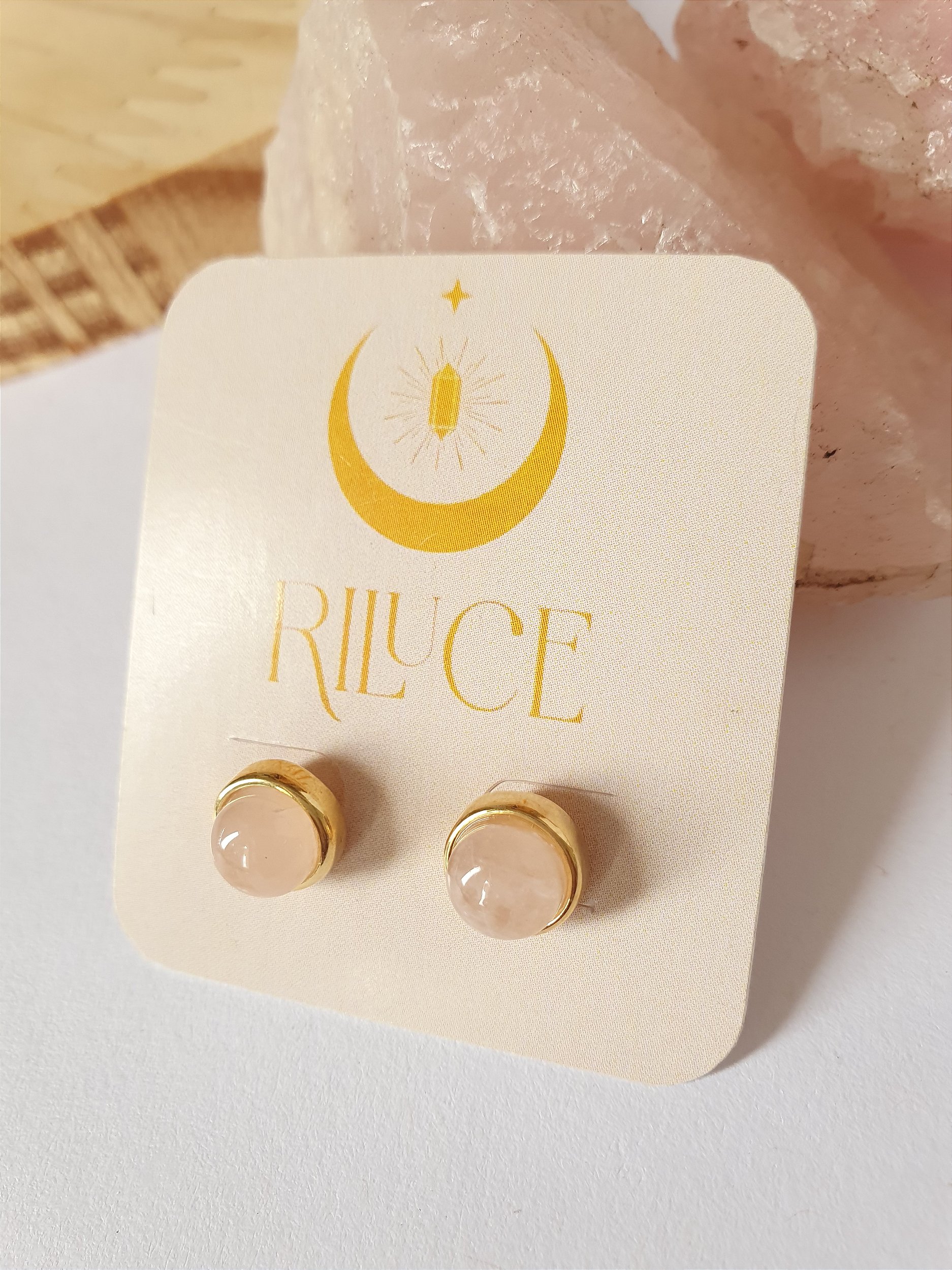 Brinco com pedra natural de quartzo rosa e tarracha dourada.