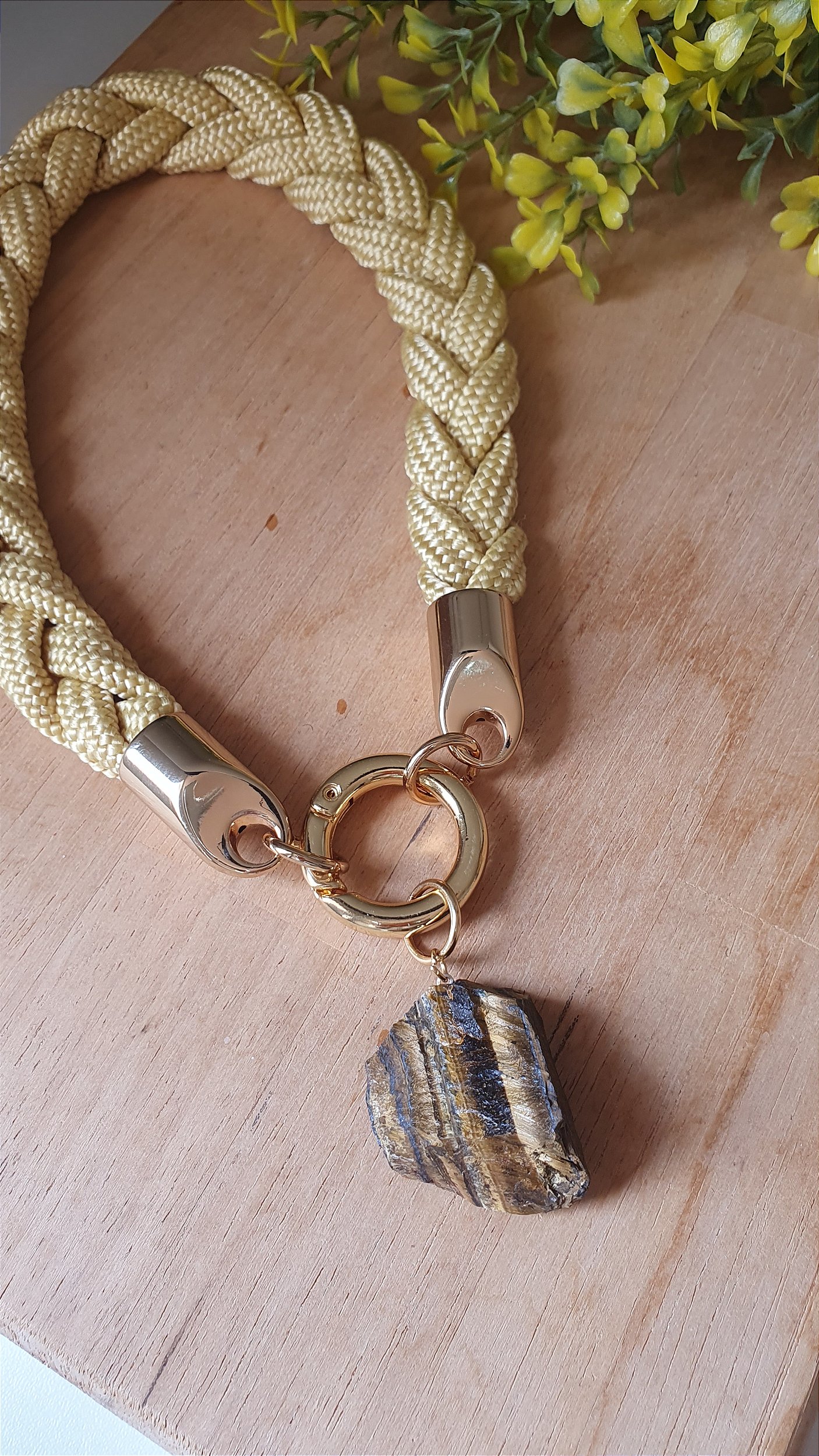 Vem com um pingente bruto de olhode tigre, mais pingentes podem ser adquiridos separadamente.
