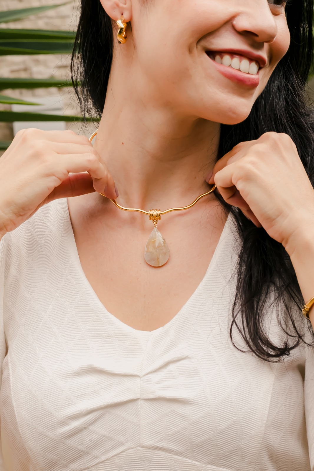 O Colar Alvorada Onda da Riluce é confeccionado com aro de metal ondulado com corrente extensora e pingente de pedra natural.