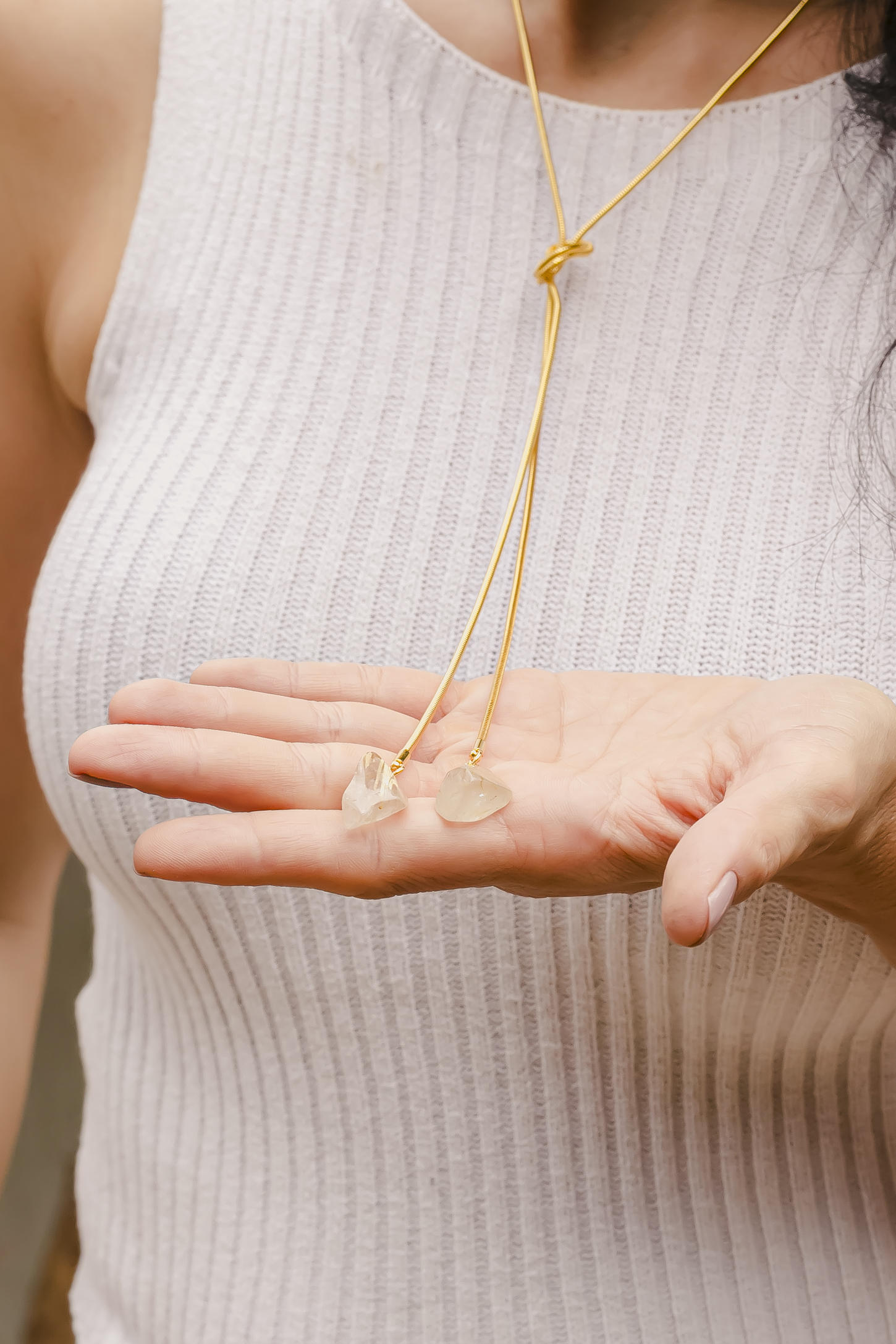 O Colar Adhara da Riluce é confeccionado manualmente com corrente rabo de rato e dois pingentes de pedras naturais. É um colar contínuo e pode ser utilizado tanto com as pedras na frente quanto nas costas.