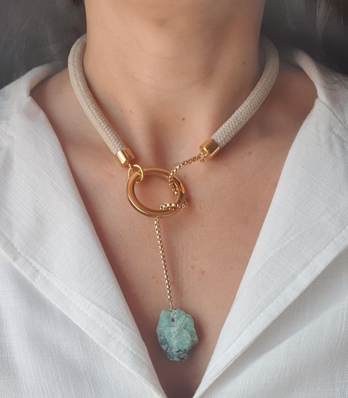 Colar em corda de polipropileno 8mm na cor crú, corrente dourada e pedra de esmeralda.