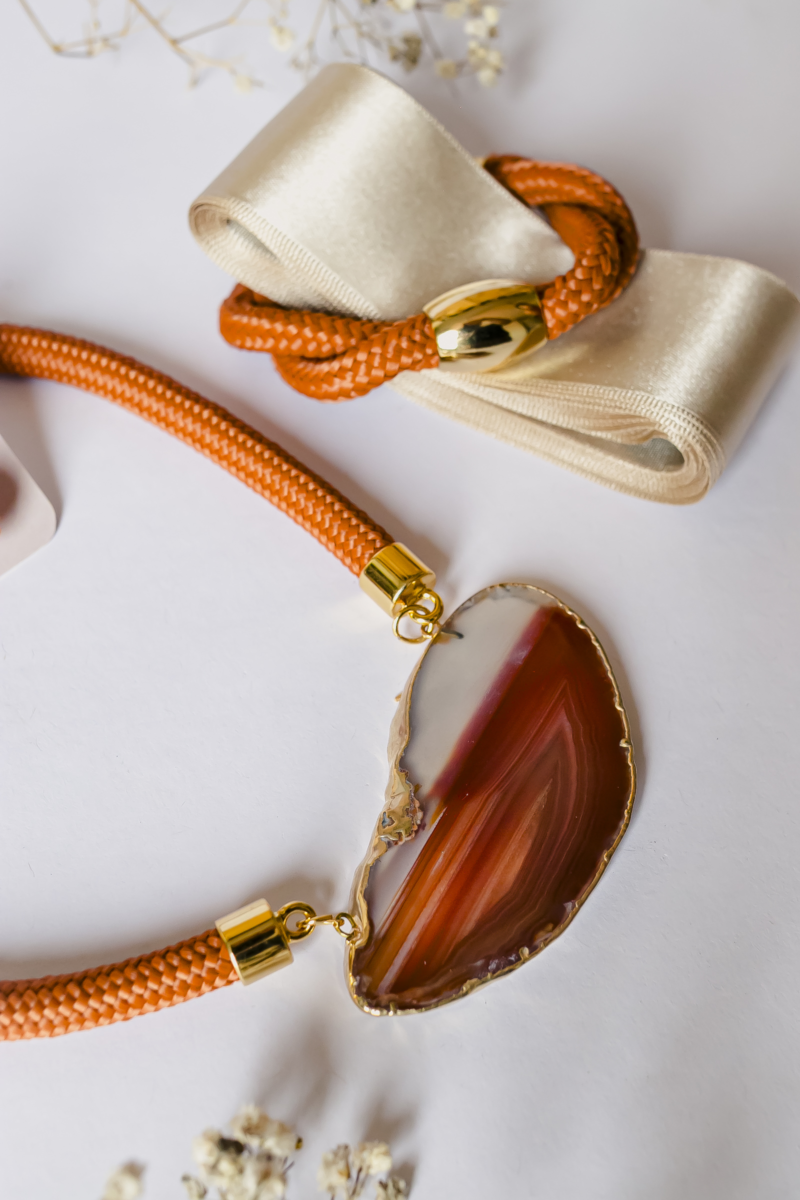 O Colar Atria Corda da Riluce é confeccionado corda de polipropleno e pedra natural com dois furos.