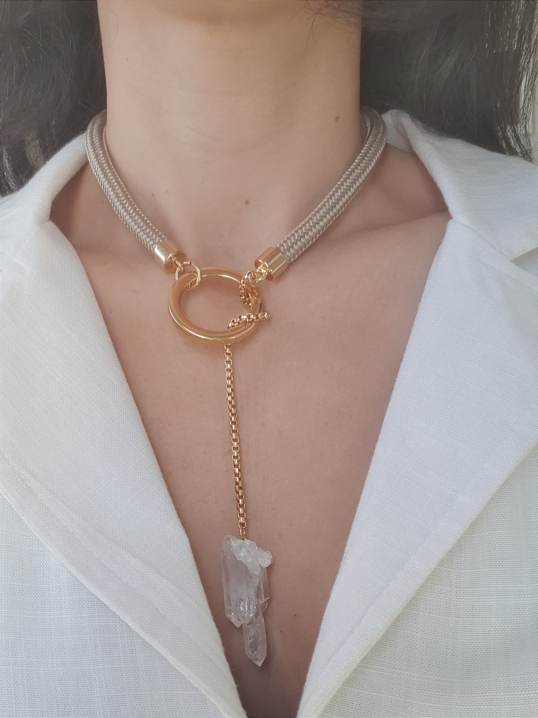 Colar em corda de polipropileno 8mm na cor crú, corrente dourada e pedra de quartzo cristal.
