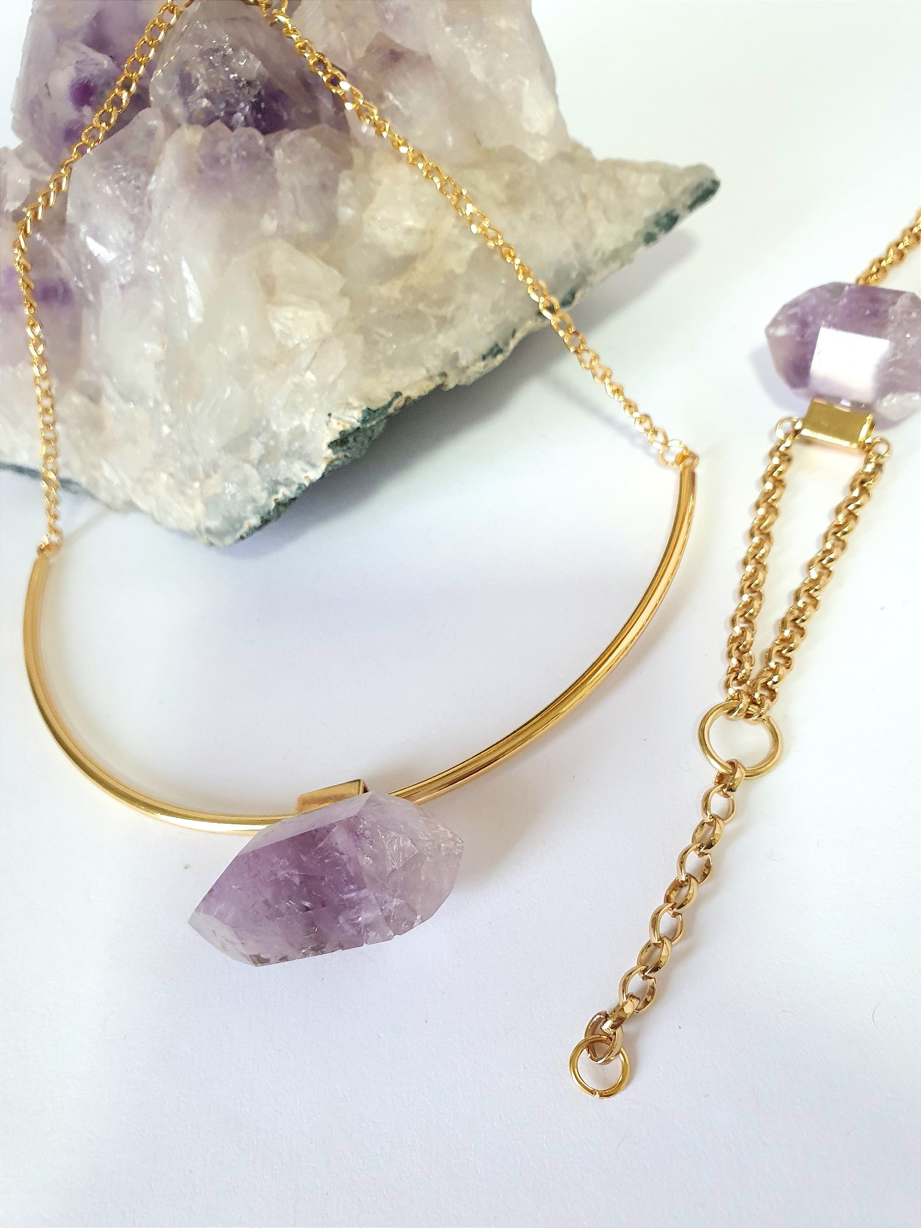 Conjunto contendo colar modelo alvorada com Ametista biterminada e pulseira ametista biterminada.