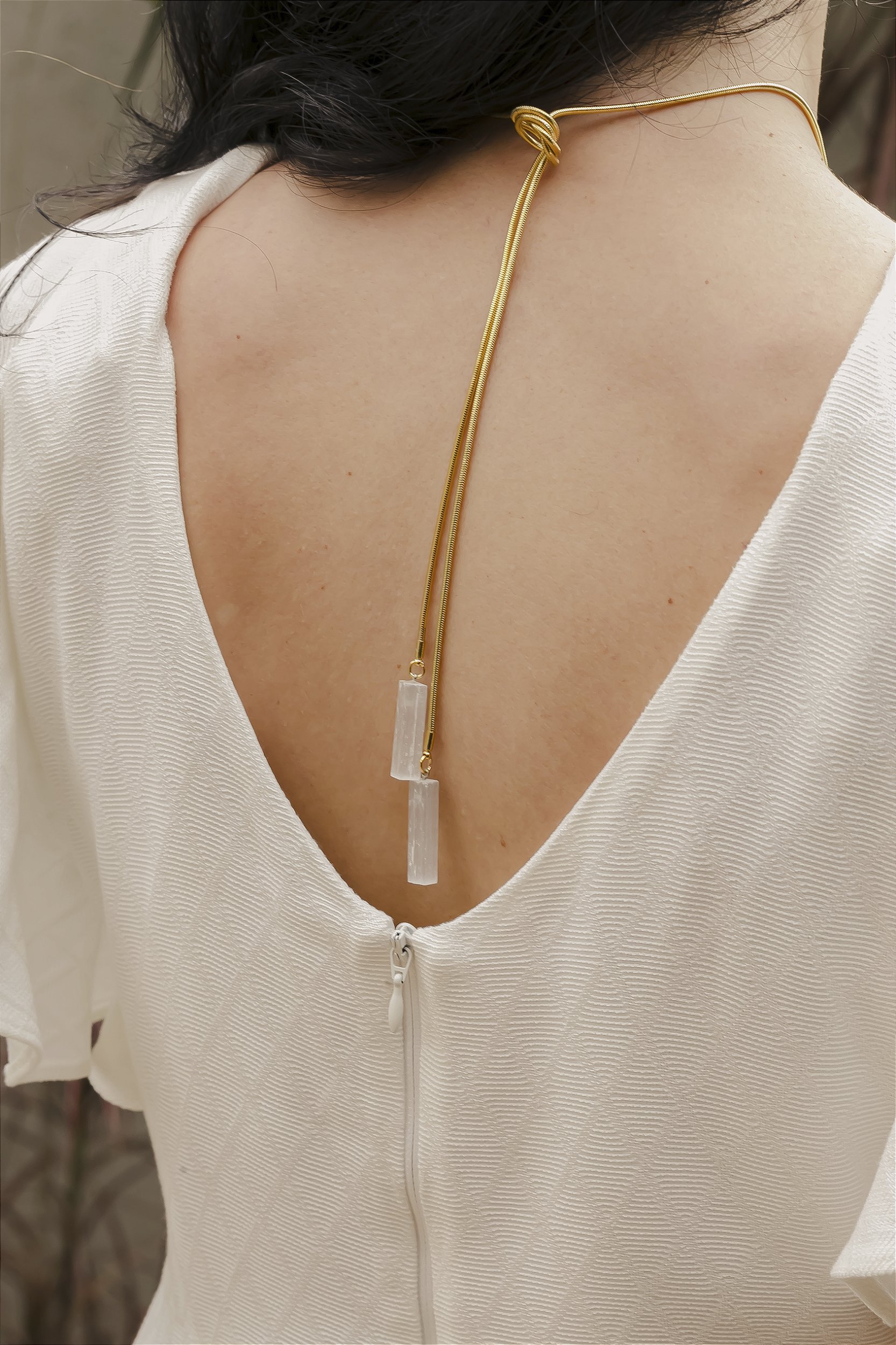 O Colar Adhara da Riluce é confeccionado manualmente com corrente rabo de rato e dois pingentes de pedras naturais. É um colar contínuo e pode ser utilizado tanto com as pedras na frente quanto nas costas.