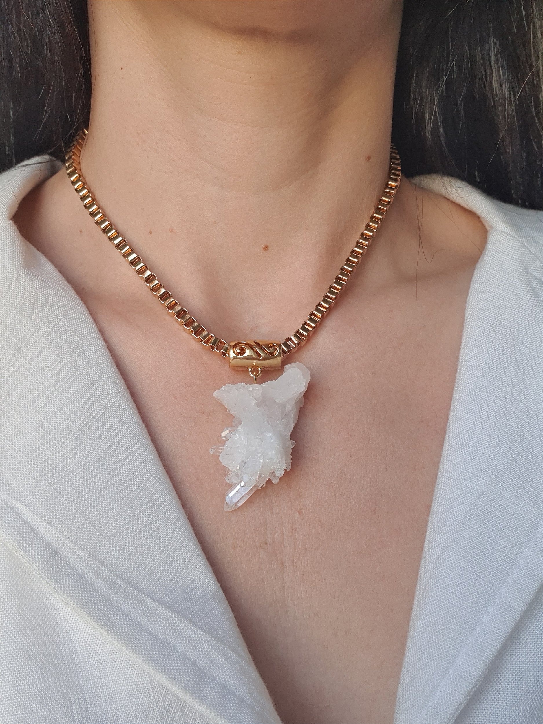 Colar em corrente dourada com pedra de drusa de cristal